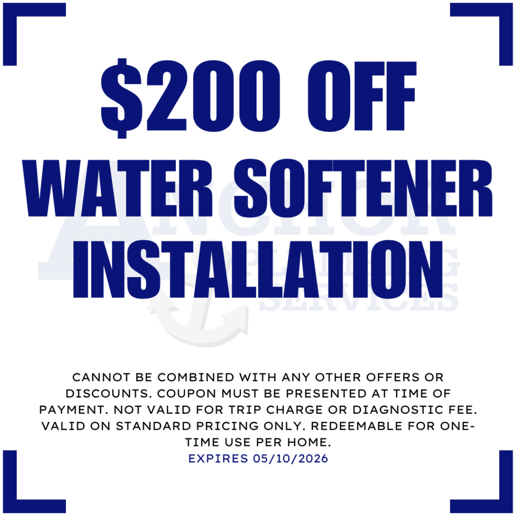Call (726) 215-4562 or book online at anchorplumbingservices.com. Mention the $200 water softener offer when scheduling. The discount is applied to your installation invoice before payment.